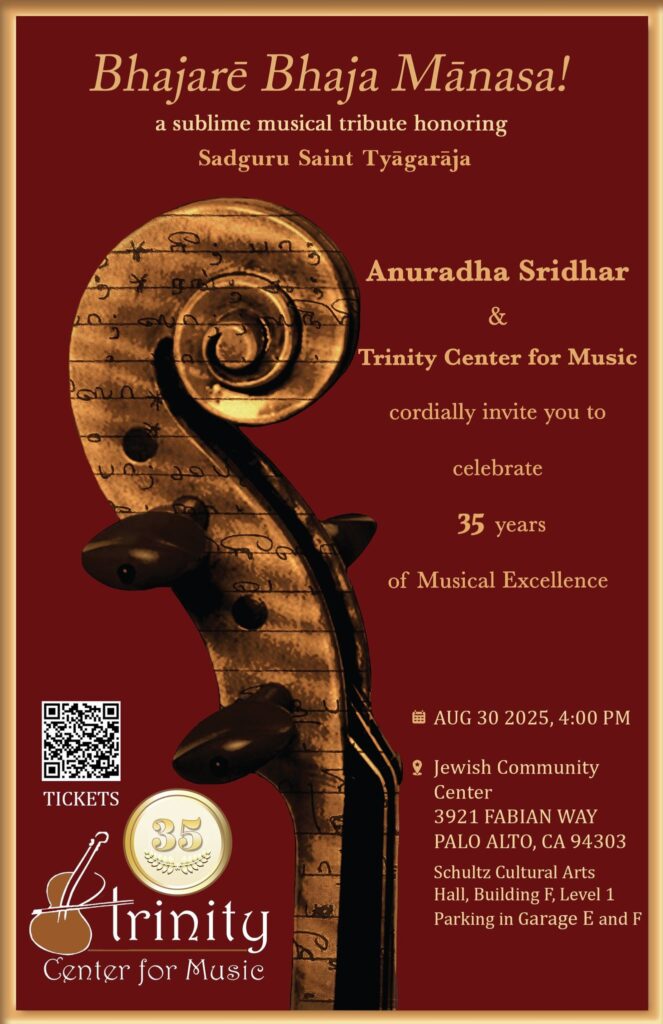 Anuradha Sridhar and students of Trinity Center for Music proudly welcome you to partake in a musical tribute that is a sacred offering to the venerable Carnatic art form and a celebration of an enduring legacy. This concert marks a dual landmark milestone: the 35th anniversary of Trinity Center for Music and 50 glorious years of Anuradha’s journey as a virtuoso violinist, vocalist, and composer.